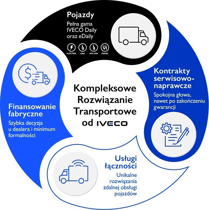 * Kwota 1999 zł stanowi przykładową miesięczną ratę, obliczoną dla reprezentatywnego modelu IVECO Daily furgon 35S18 roku modelowego 2024, przy finansowaniu w formie leasingu dla firm na okres 48 miesięcy, z wpłatą własną w wysokości 29%. Kwota nie obejmuje kosztów ubezpieczenia. Przyznanie finansowania jest uzależnione od wyniku badania zdolności kredytowej wnioskującego o finansowanie. Szczegółowych informacji udzielają Autoryzowani Dealerzy IVECO. Niniejsza propozycja nie stanowi oferty i jest skierowana wyłącznie do przedsiębiorców. Podmiotem finansującym jest CNH Industrial Capital Europe SAS Spółka Akcyjna Uproszczona z siedzibą w Warszawie. Akcja jest ograniczona w czasie. Z propozycji można skorzystać do 30 września 2024 roku.